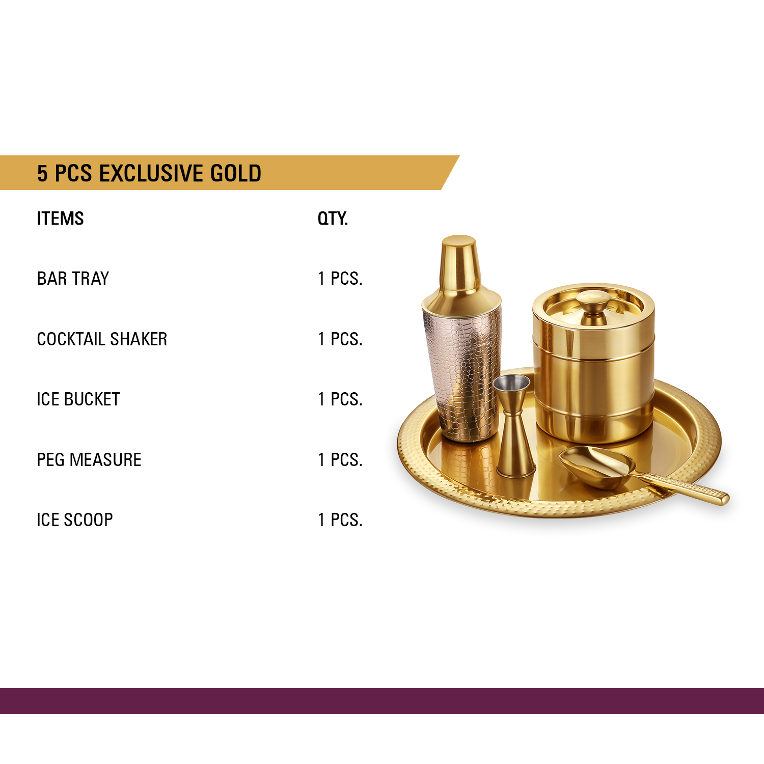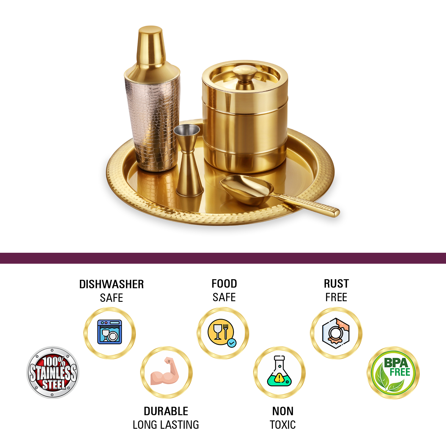 Stainless Steel 5pcs Gold Bar Tool Set | 16” Bar Tray, 1000 ml Cocktail Shaker, 1.5 L Ice Bucket, Ice Scoop, Peg Measure | Premium Barware for Home & Bar
