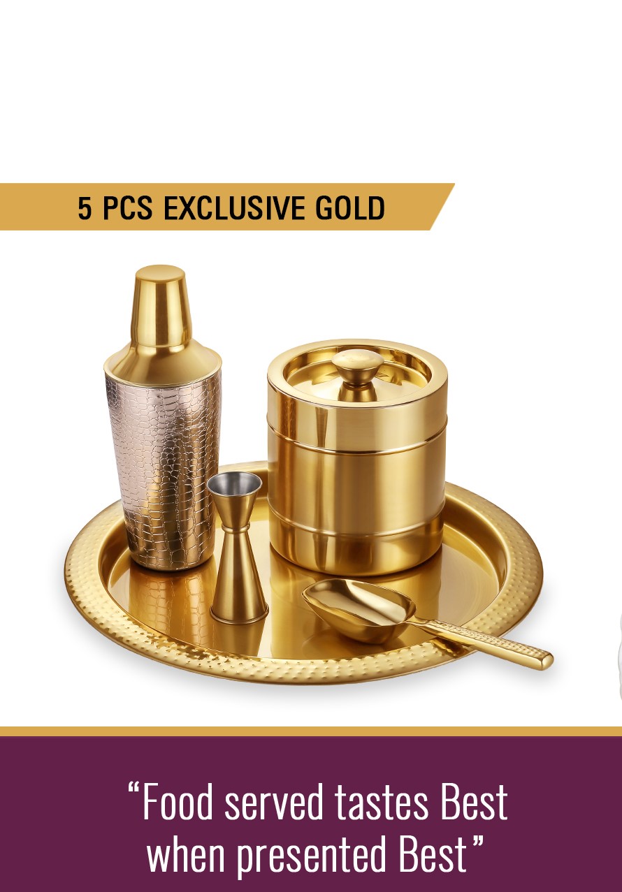 ✨ Elevate your bar experience with this Stainless Steel 5pcs Gold Bar Tool Set featuring a 16” bar tray, 1000 ml cocktail shaker, 1.5L double wall ice bucket, ice scoop, and peg measure (30/60 ml). Perfect for cocktails, mocktails, whiskey & more. Shop Jack and Rex premium barware.