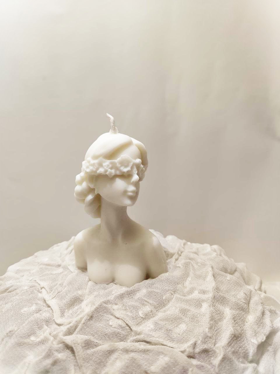White lady bust candle with a floral blindfold and sculpted hair, placed on soft white fabric with a neutral background