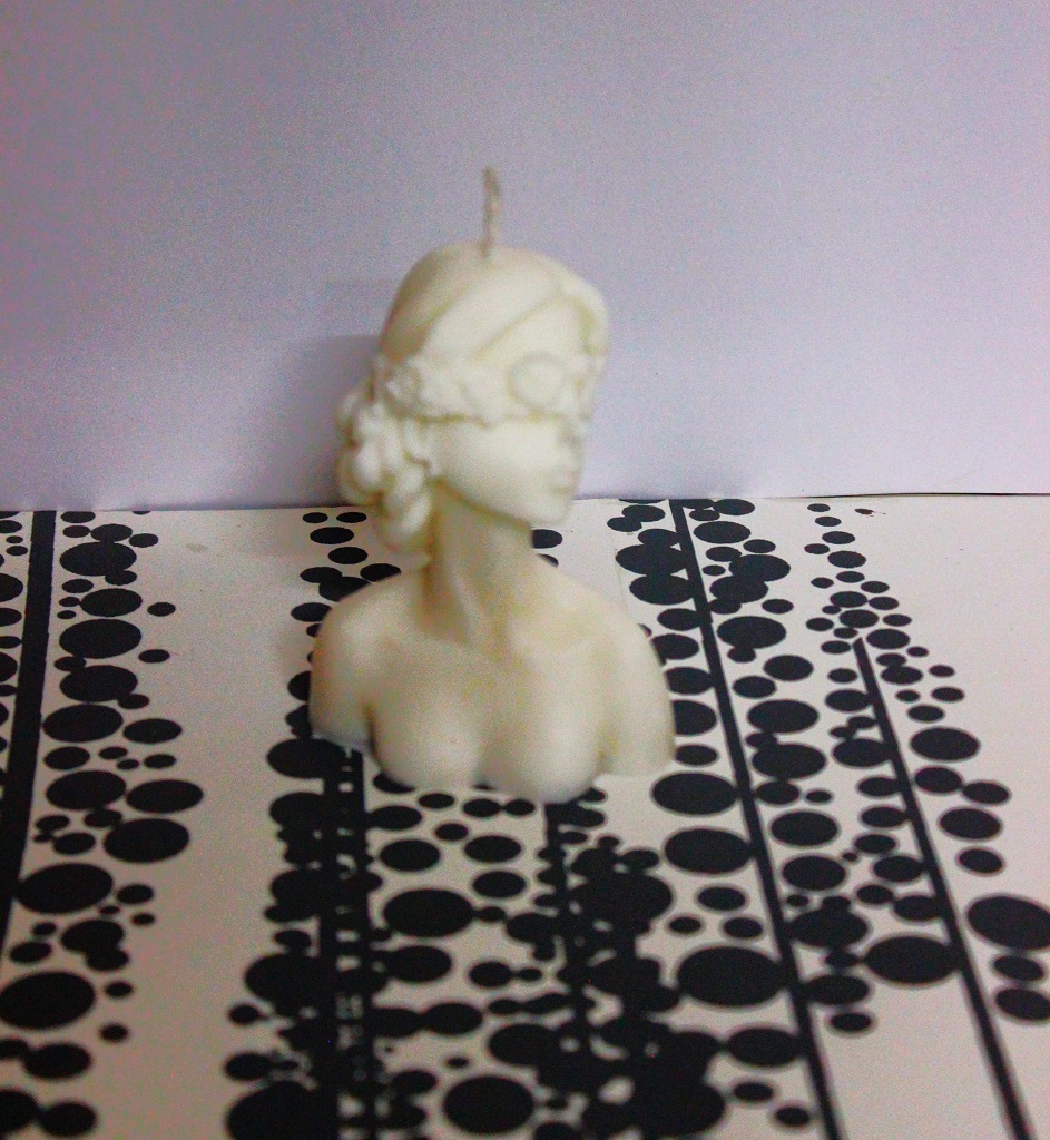 White lady bust candle with floral bun hairstyle, placed against a black background